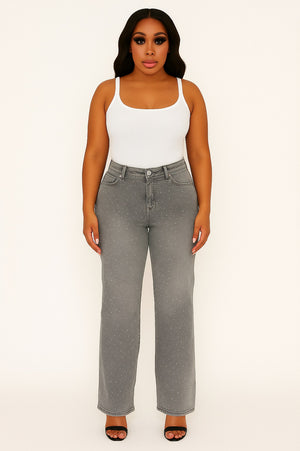Add sparkle to your denim collection with these grey diamante wide-leg jeans. Crafted with a flattering super-stretch fit, they’re scattered with shimmering embellishments for a statement look. Available in: Grey
